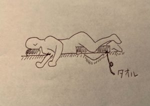 ※身体を横に寝た姿勢で腿の間に丸めたタオルなどを挟むと腰に負担の少ない姿勢となります。