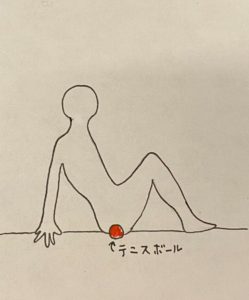 1.床にテニスボールを置き、その上に膝を立てて座る