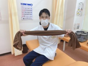 次に膝を伸ばした状態で、タオルを土踏まずの部分に