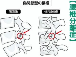 椎弓の斜め後方部分は細く衝撃に弱い構造をしており、スポーツなどで激しい運動を繰り返している内に疲労骨折を起こして亀裂が入ることがあります。