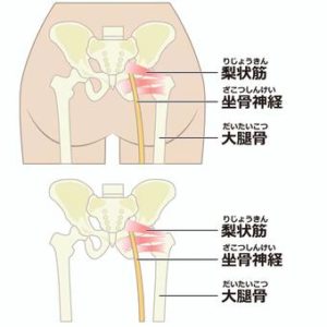 腰から太ももにかけて伸びている「坐骨神経」という神経は骨盤内にある「梨状筋」という筋肉の下を通過します。