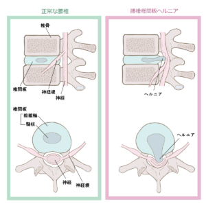 腰椎椎間板ヘルニアでは腰や臀部に痛みがあり下肢に放散するようなしびれや痛み、下肢に力が入りづらくなることがあります。