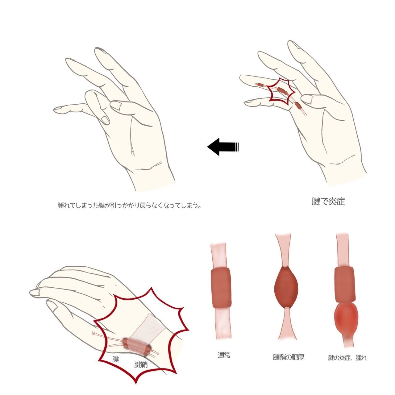 その動きが使いすぎで負担が増えてしまうと腱が太くなってしまったり、腱鞘が硬く厚くなってしまい擦れ合うようになり、炎症により腫れが起こり腱の動きが制限されてしまいます。